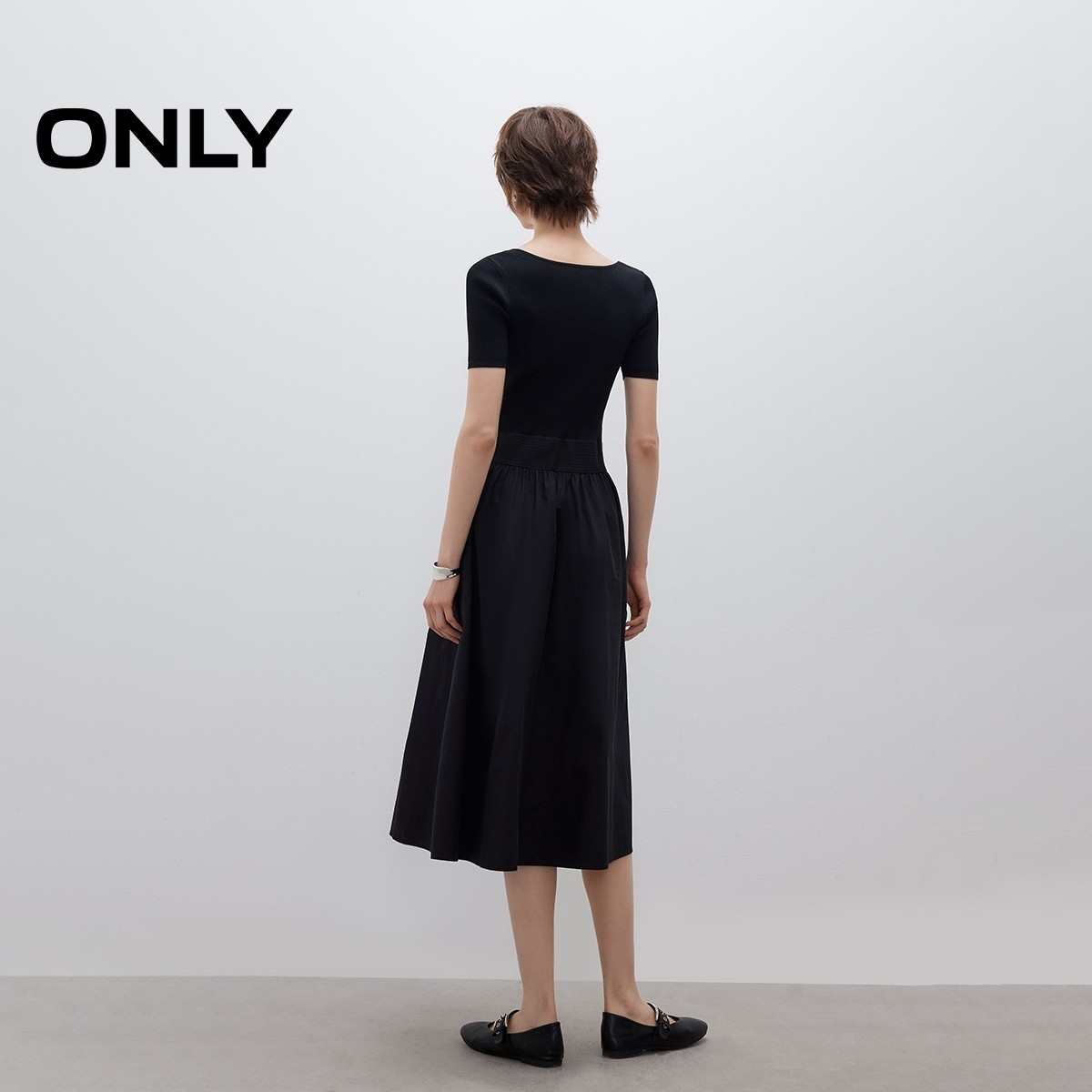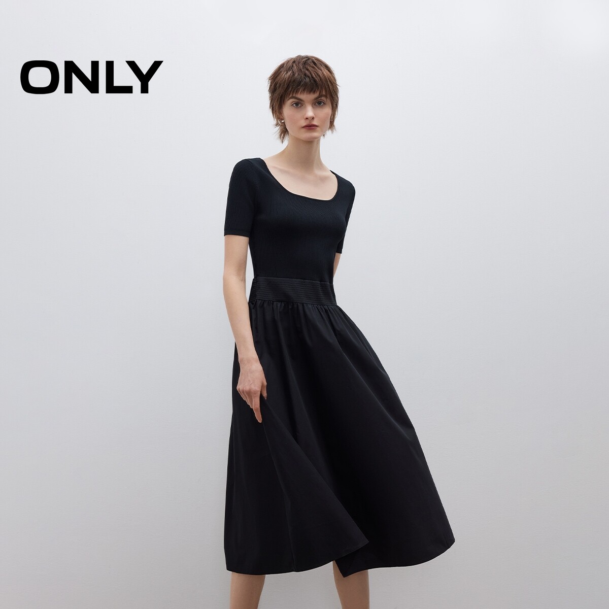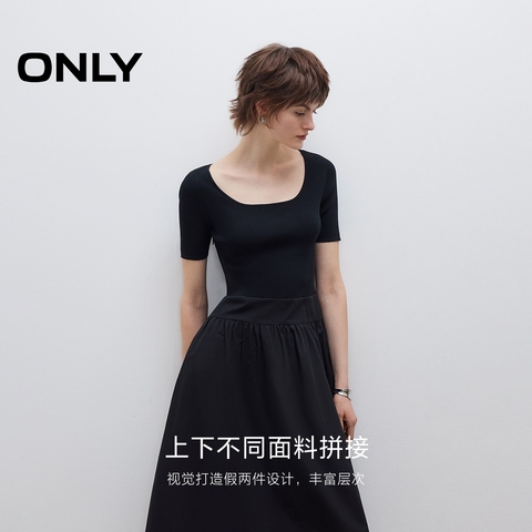 ONLY2025夏季新款优雅气质圆领显瘦修身纯色拼接中长款连衣裙女