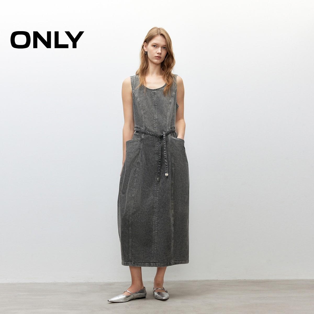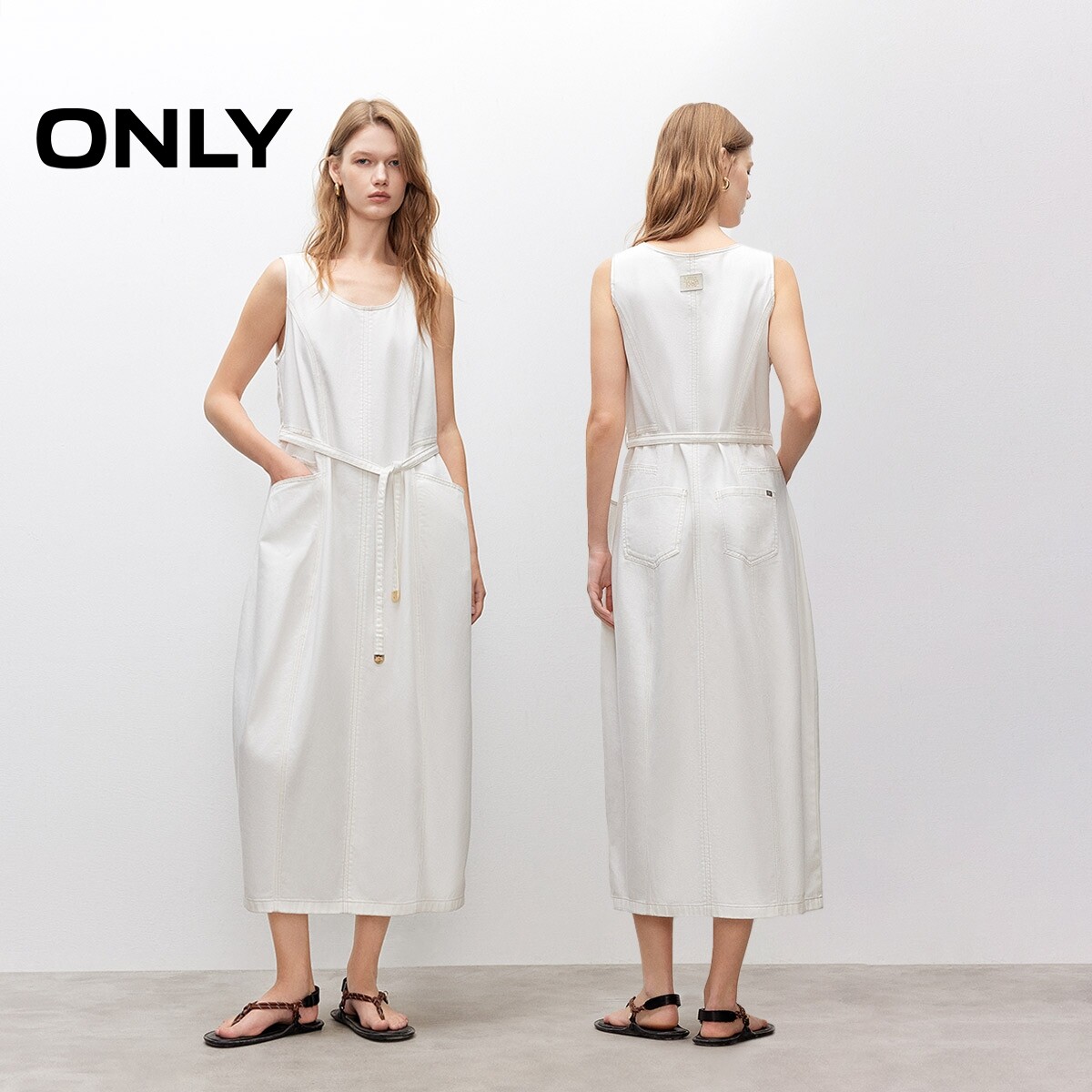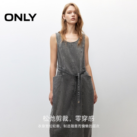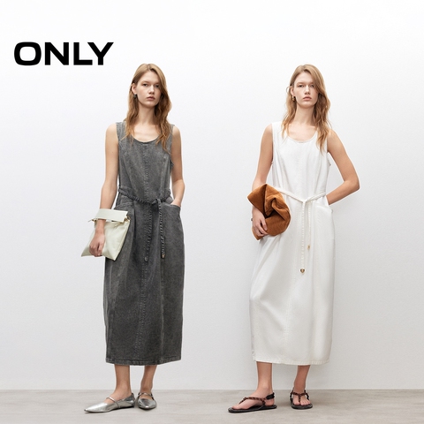 ONLY2026春季新款拼接剪裁宽松显瘦U型领无袖白色牛仔长裙连衣裙