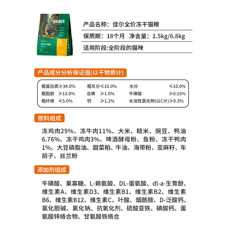 佳尔猫粮全价成猫专用粮1.5kg营养全期通用无谷物蛋黄冻干粮英短