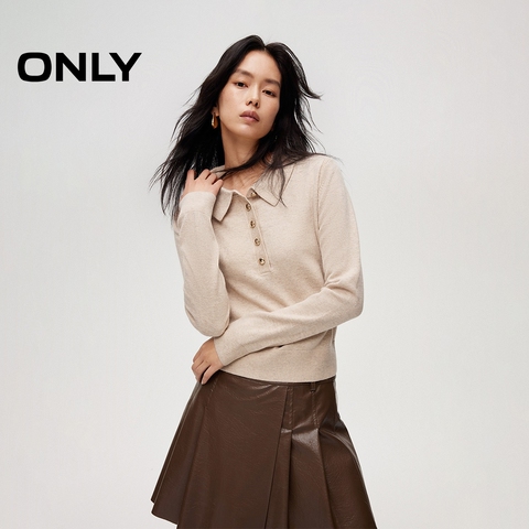 ONLY2026春季新款简约气质正肩含绵羊毛polo领金属扣毛衣针织衫女