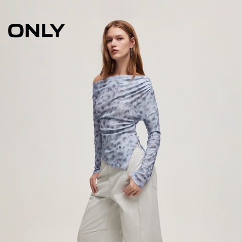 ONLY2026春季新款性感显瘦扎染一字肩修身收腰开叉打底长袖T恤女