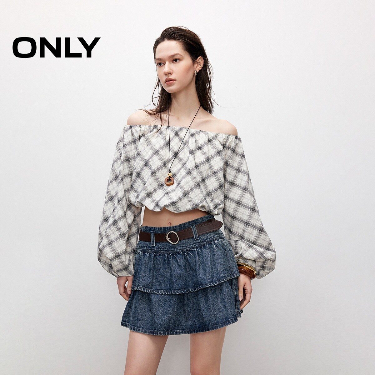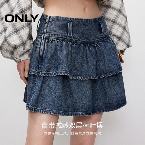 ONLY2025秋冬新款显瘦A字双层荷叶裙摆设计高腰短裙牛仔半身裙女