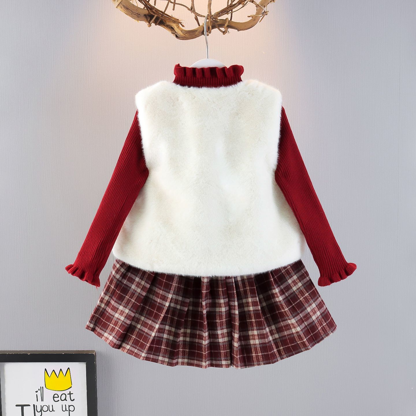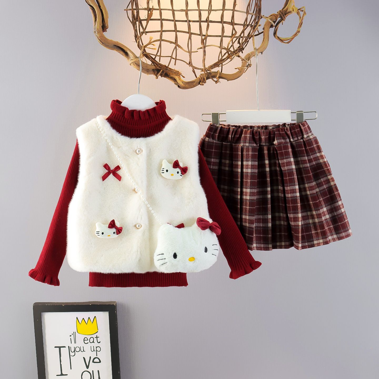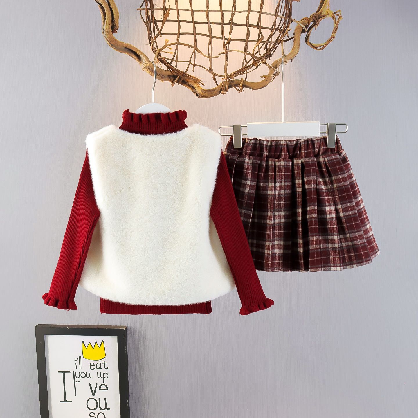 女童秋冬装洋气套装宝宝毛毛马甲加绒半身裙毛衣三件套新年拜年服