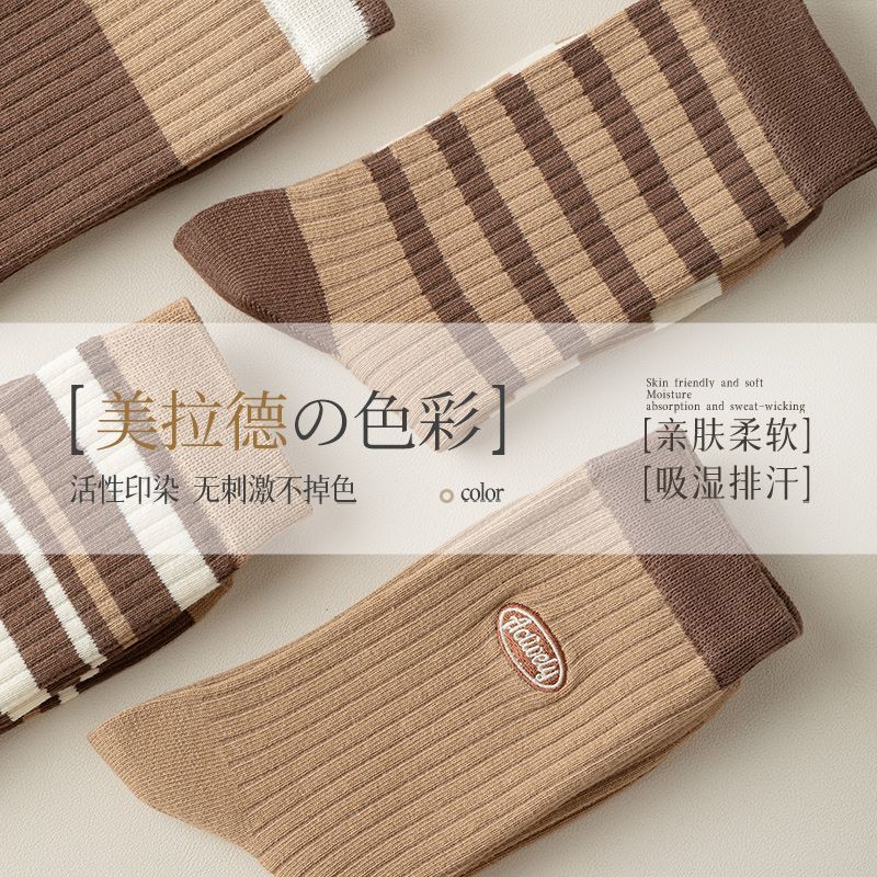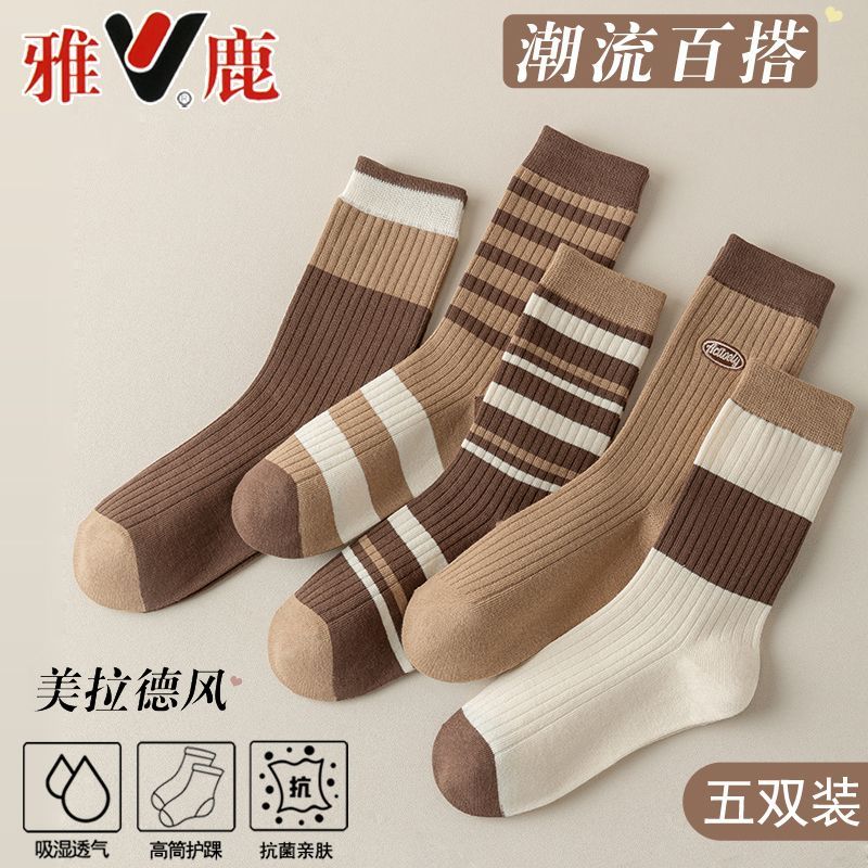 雅鹿中高筒女士袜子秋冬防臭吸汗美拉德色系刺绣条纹百搭长袜