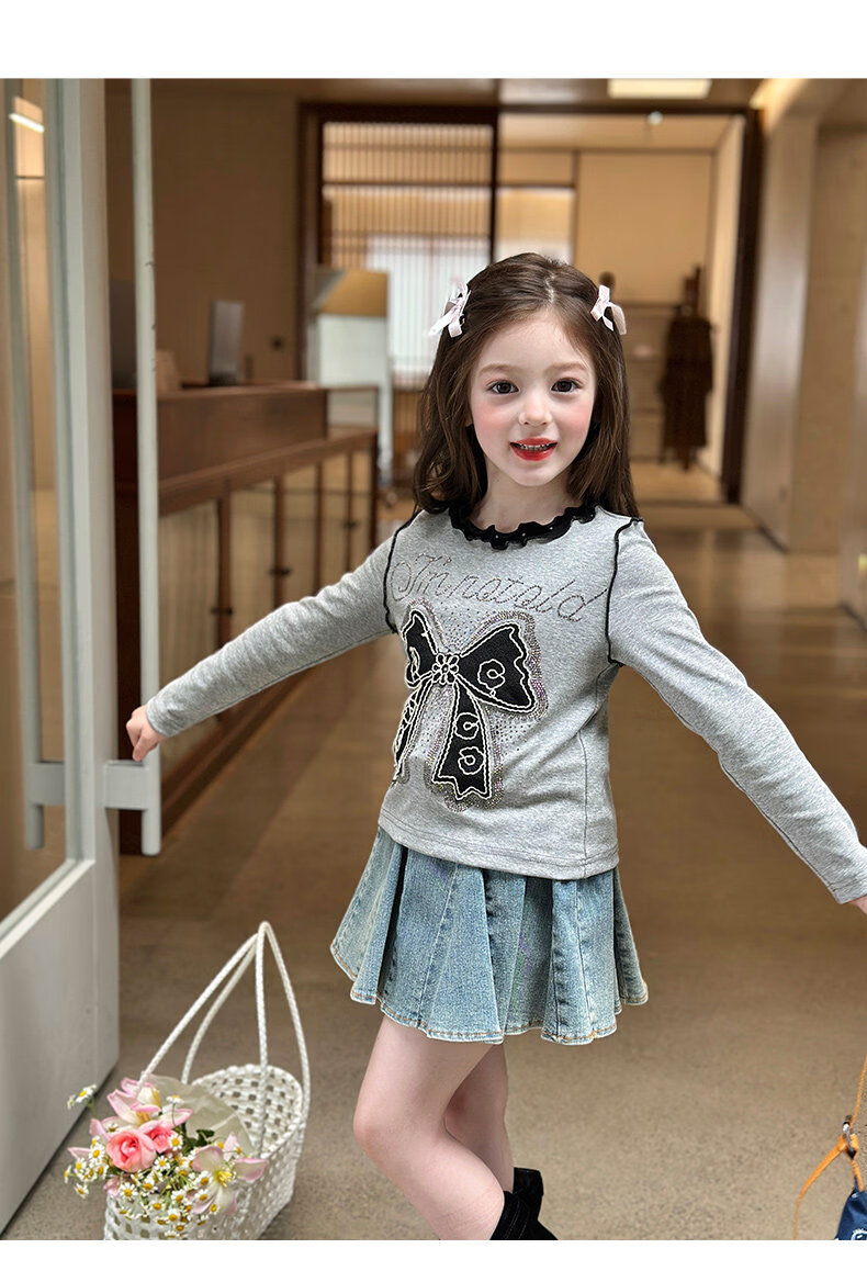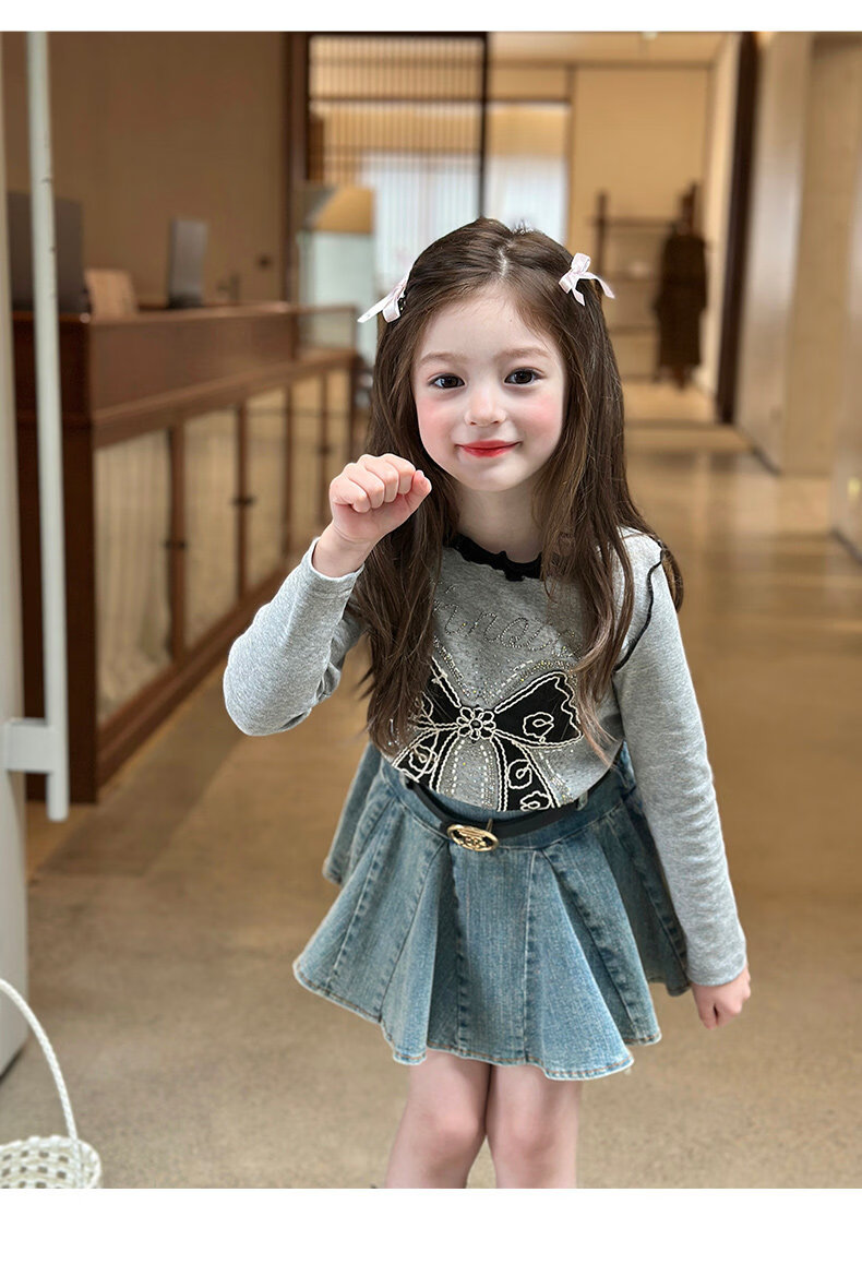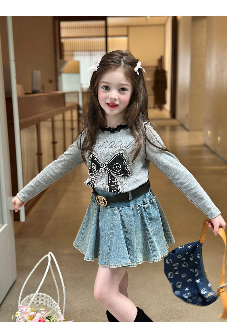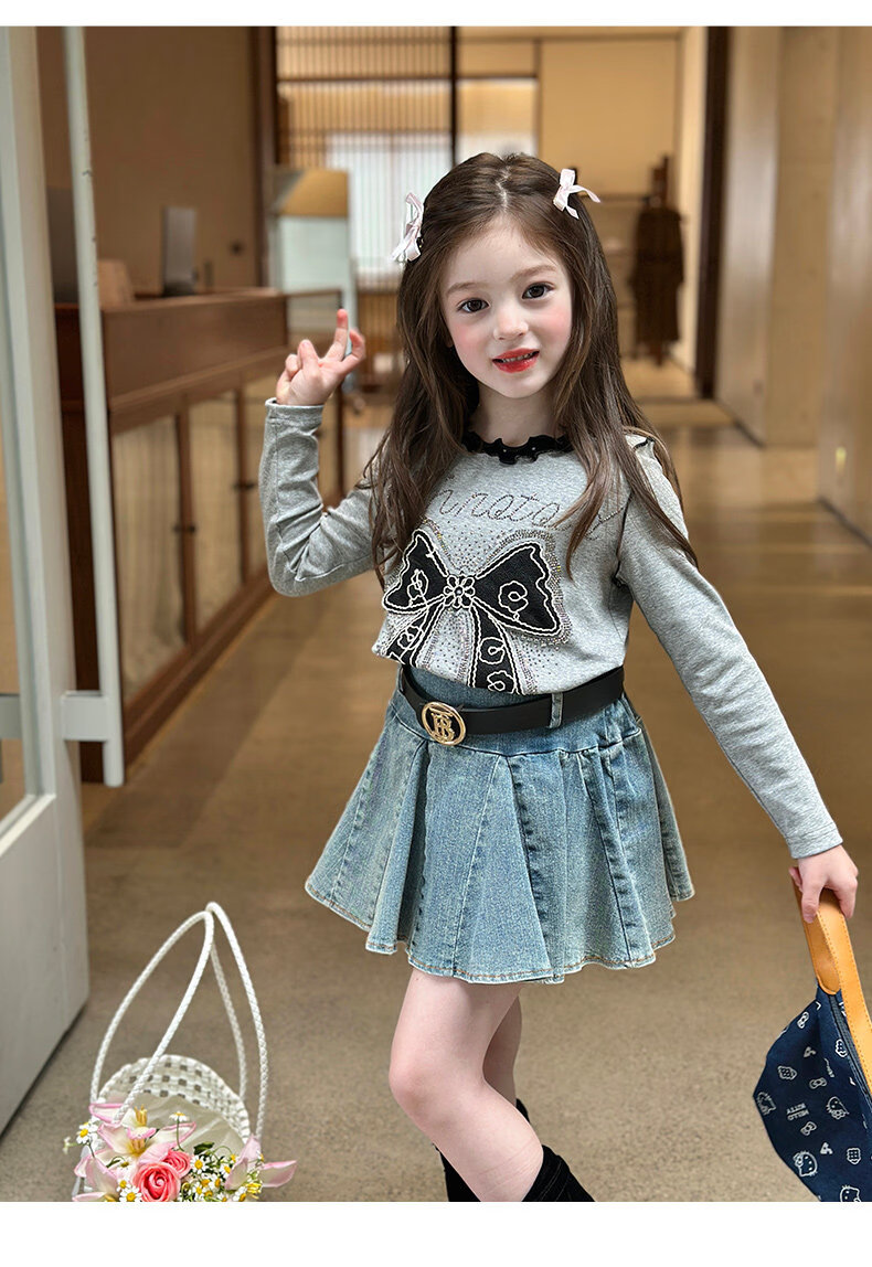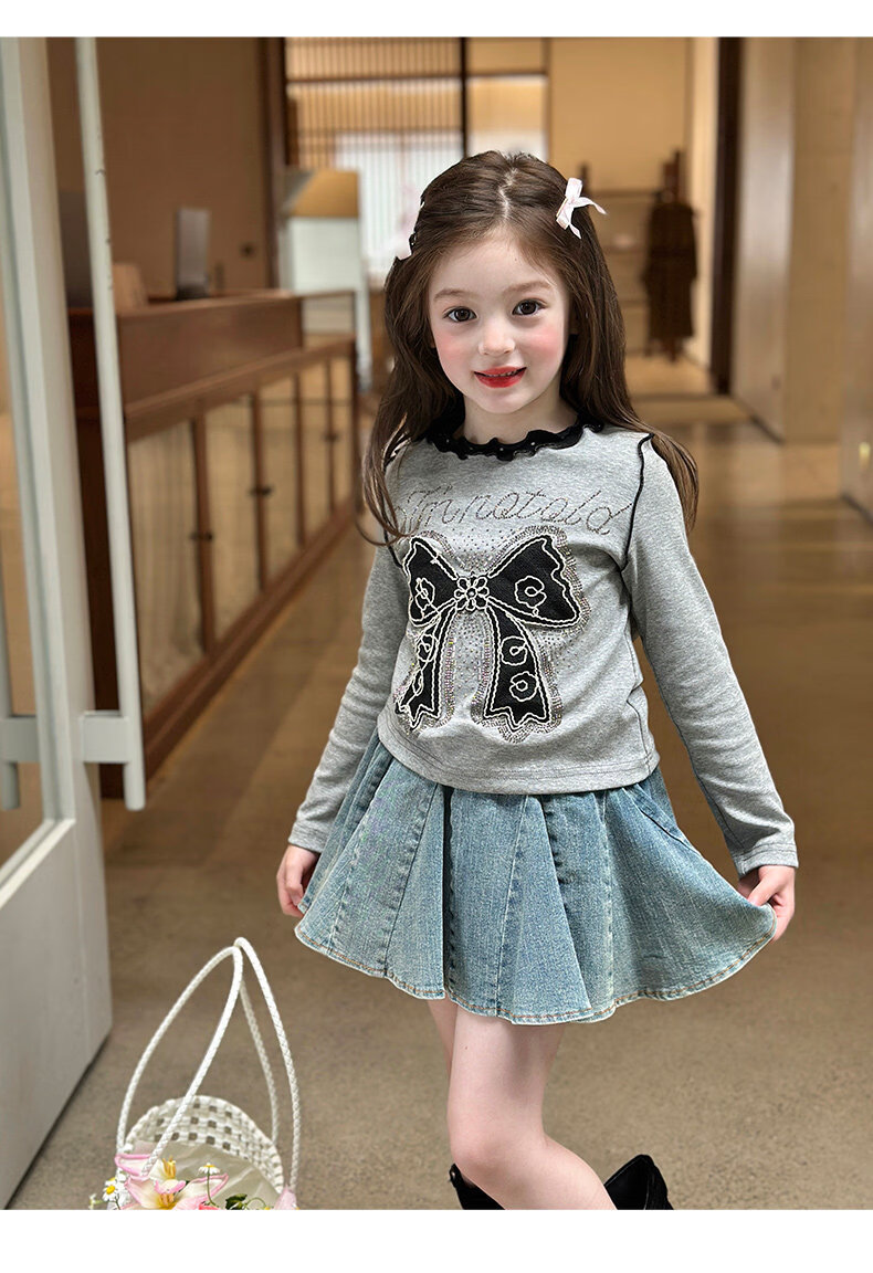 栀了成长记童装女童韩版百搭休闲上衣2026春季儿童蝴蝶结烫钻T恤 蓝色 半身裙 110 cm