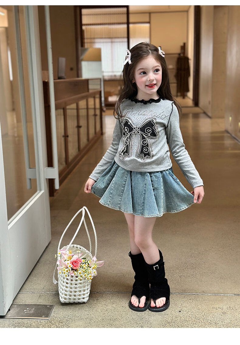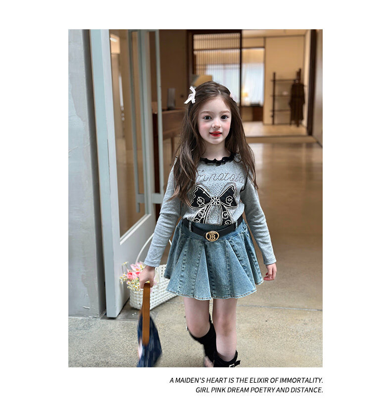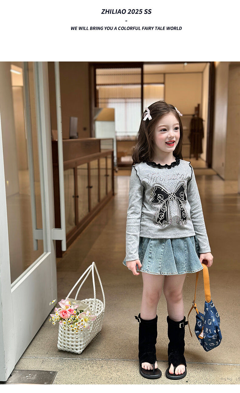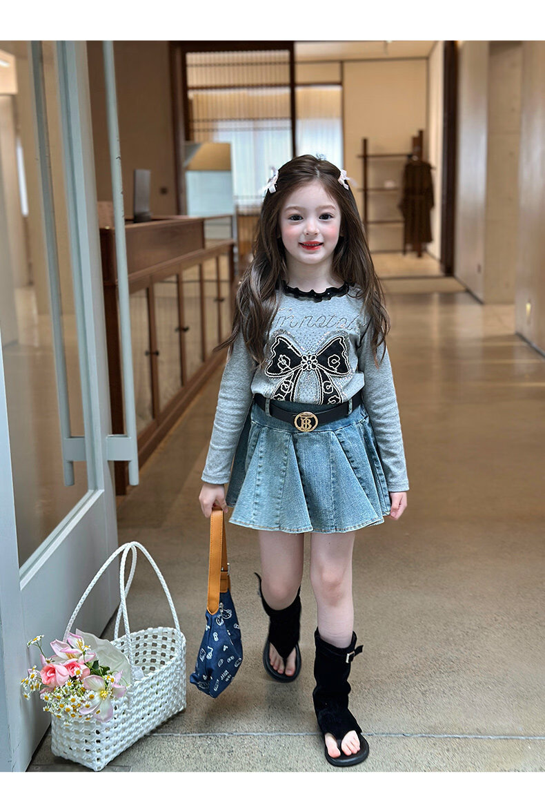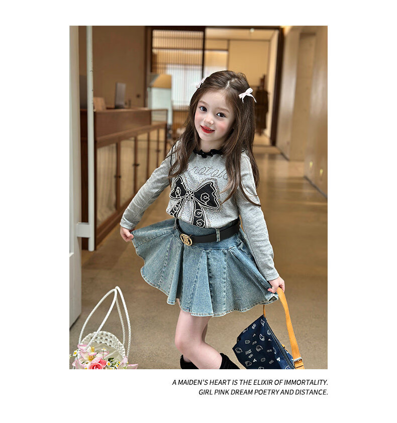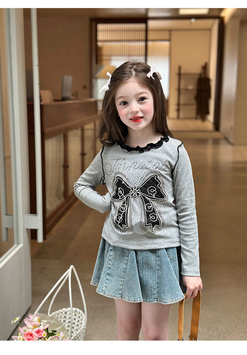 栀了成长记童装女童韩版百搭休闲上衣2026春季儿童蝴蝶结烫钻T恤 蓝色 半身裙 110 cm