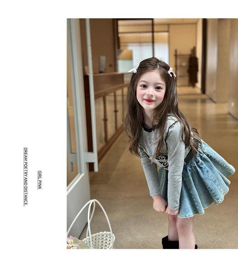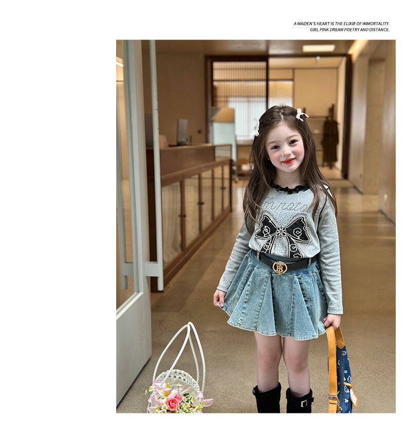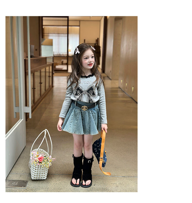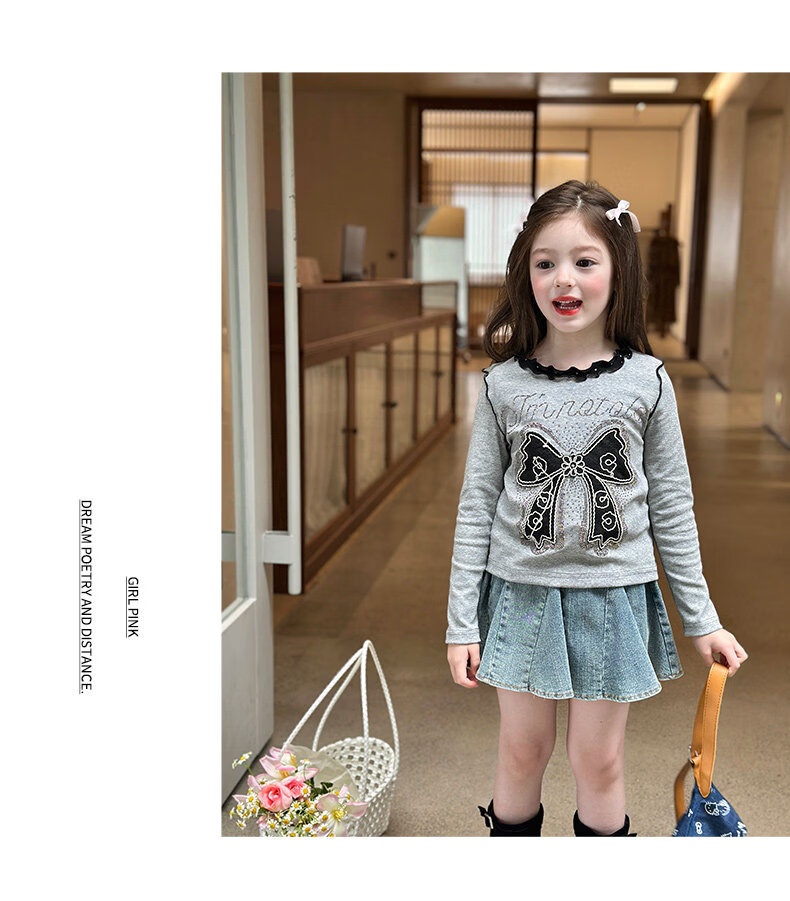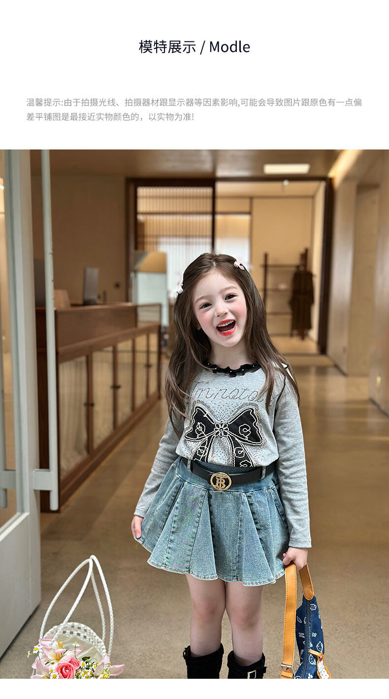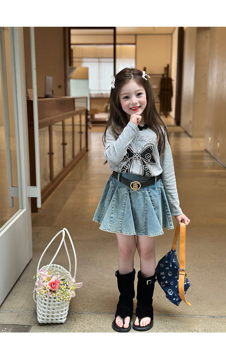 栀了成长记童装女童韩版百搭休闲上衣2026春季儿童蝴蝶结烫钻T恤 蓝色 半身裙 110 cm