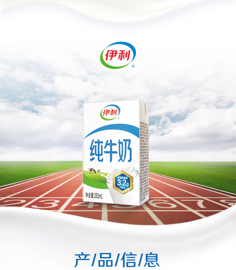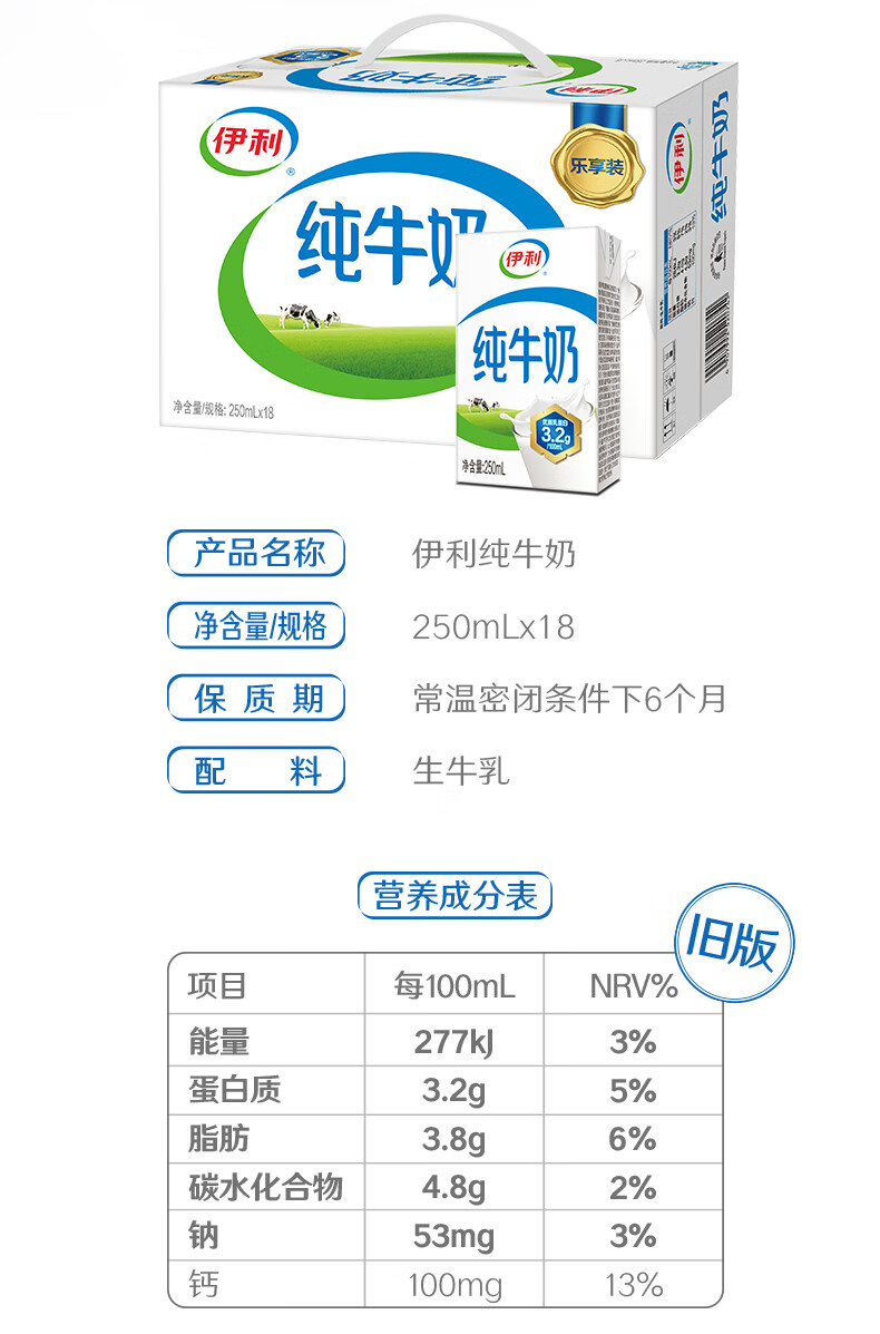 伊利全脂纯牛奶 250ml*18盒 每100ml含3.3g蛋白质 年货礼盒装