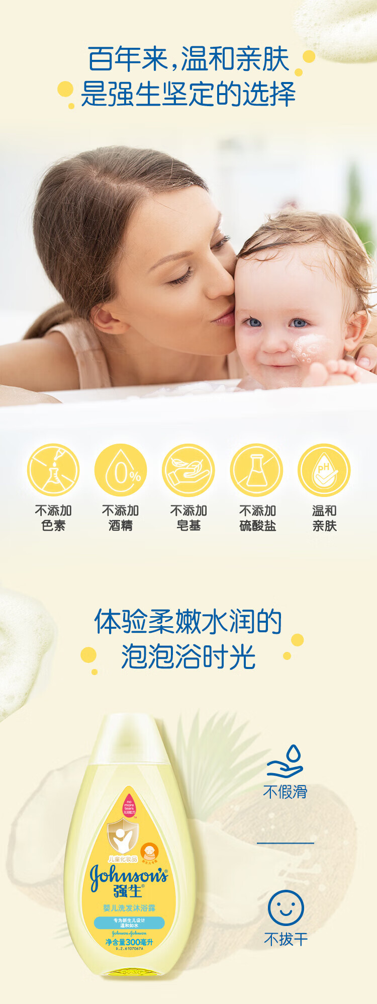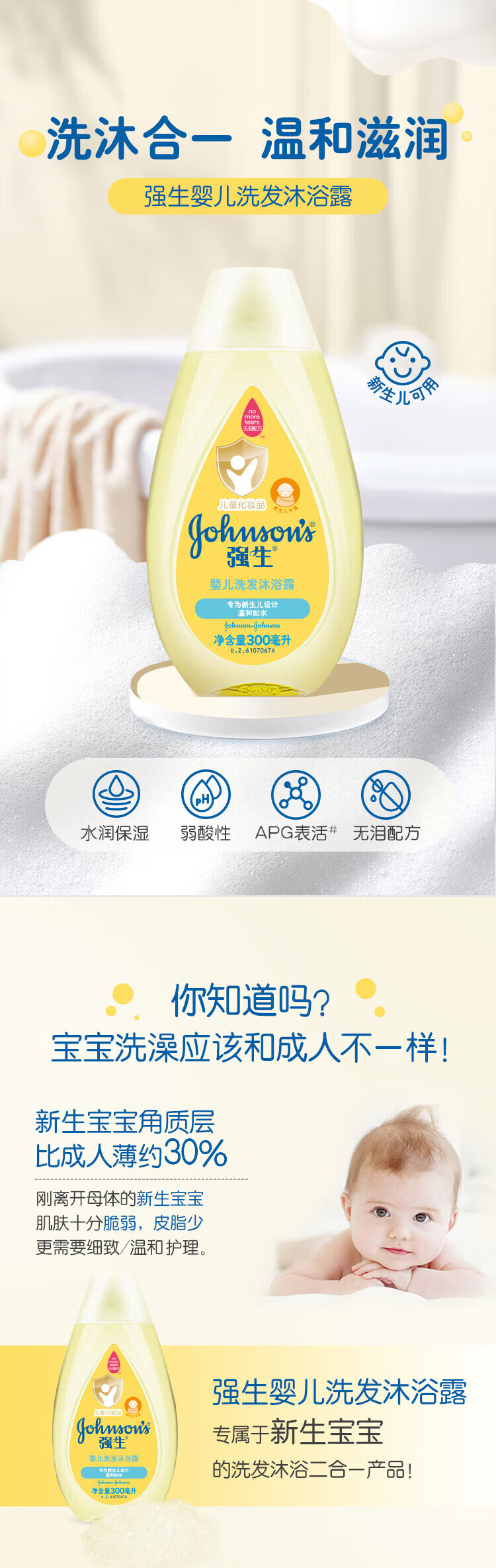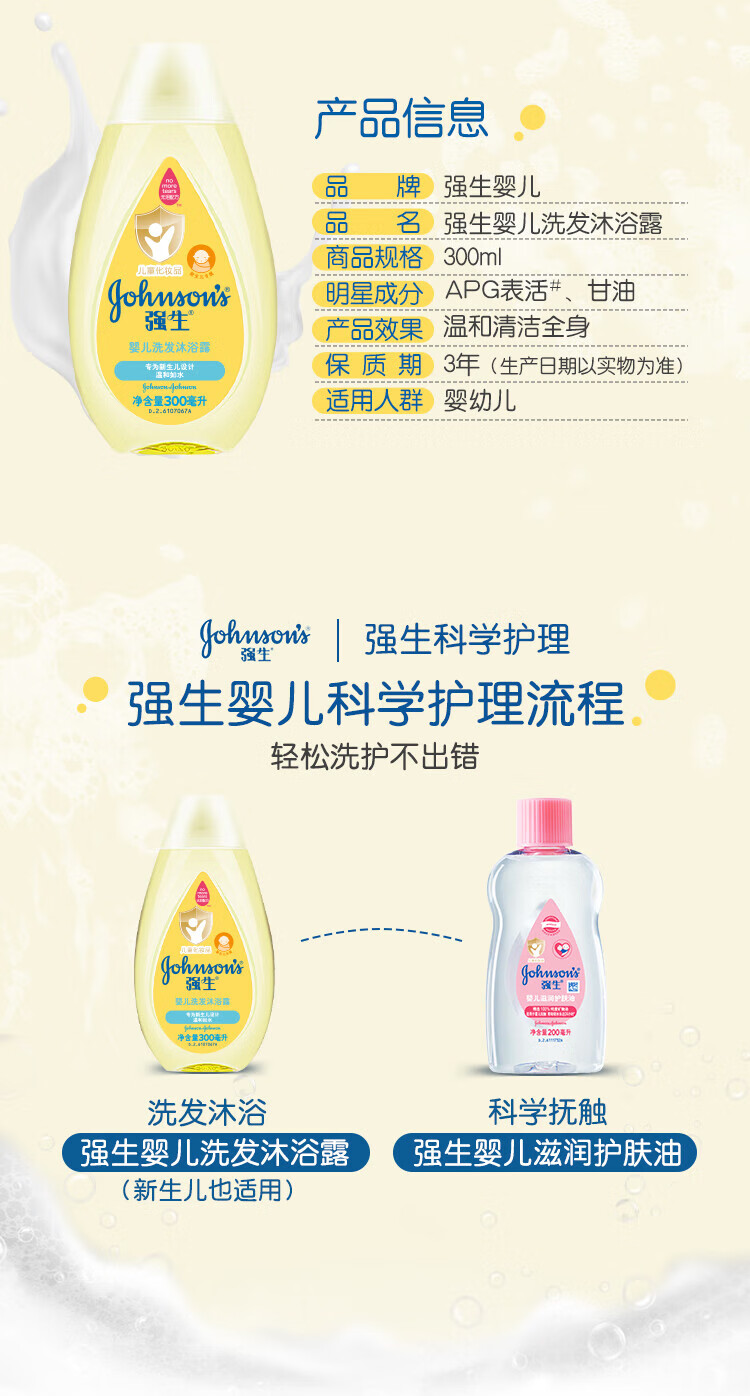 强生(Johnson)婴儿沐浴露洗发水二合一无泪配方 弱酸性新生儿宝宝沐浴露 洗发沐浴露二合一300ml+100ml
