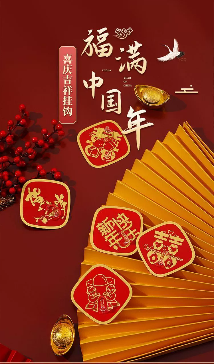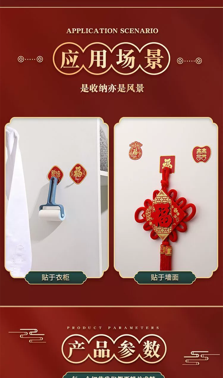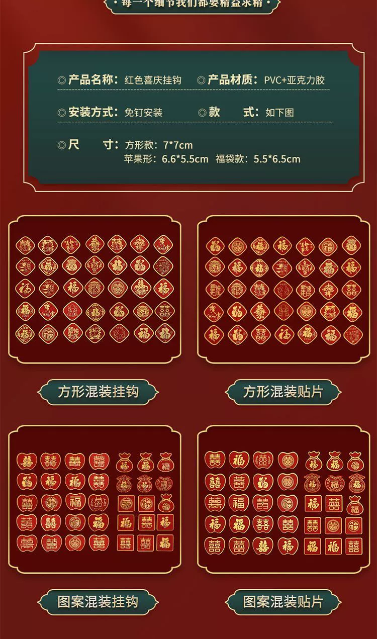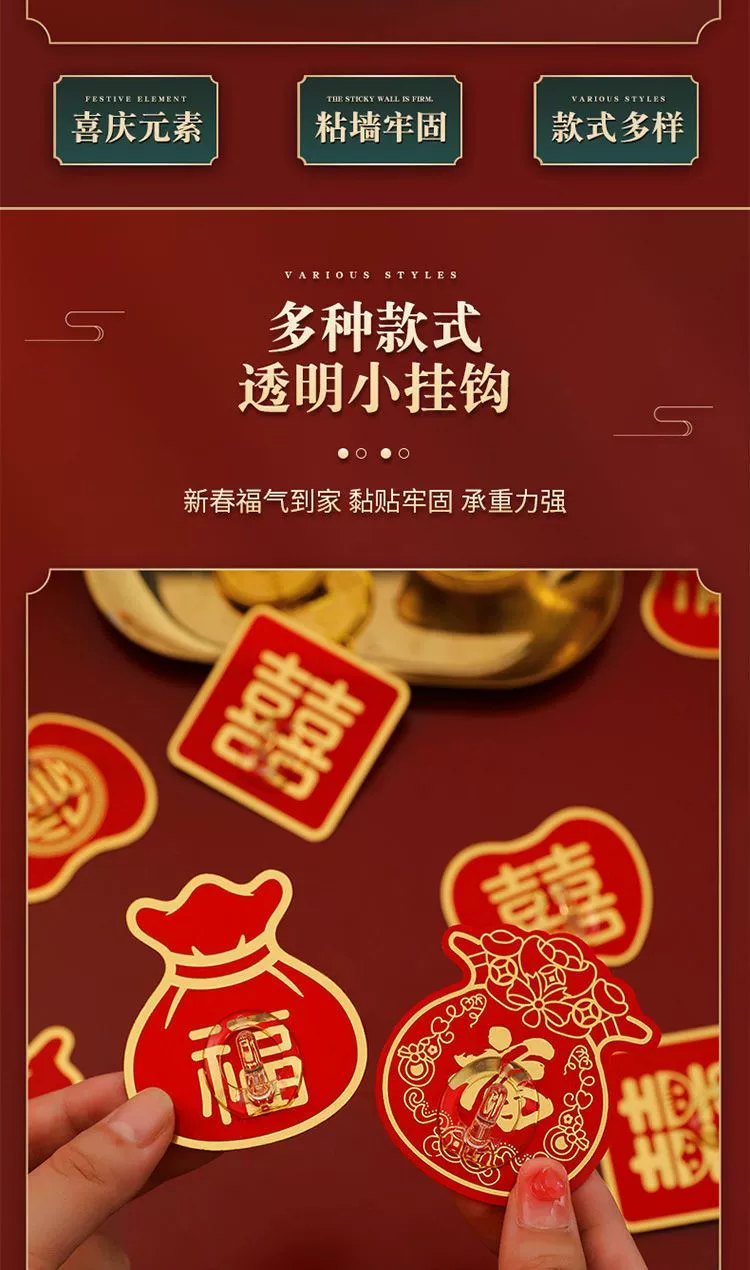 福字挂钩红色喜庆小挂钩强力粘胶免打孔挂中国结灯笼承重粘钩 【福气到家】福字-混搭10个 无规格