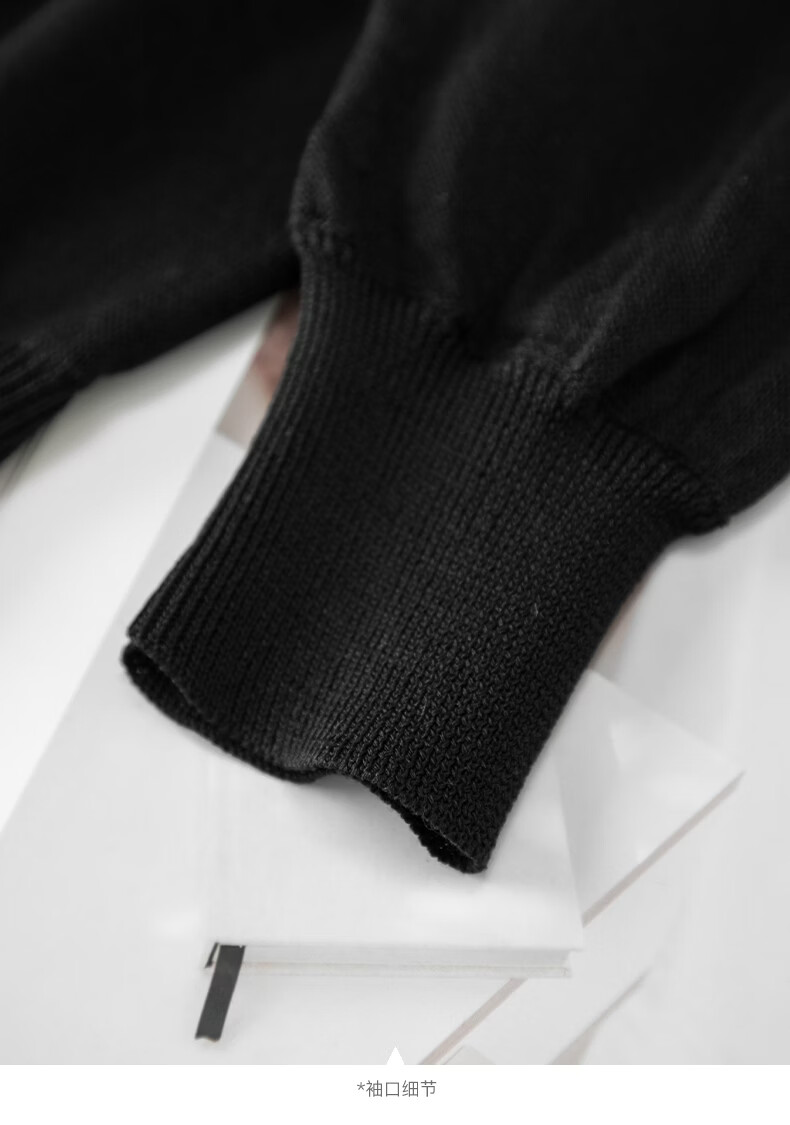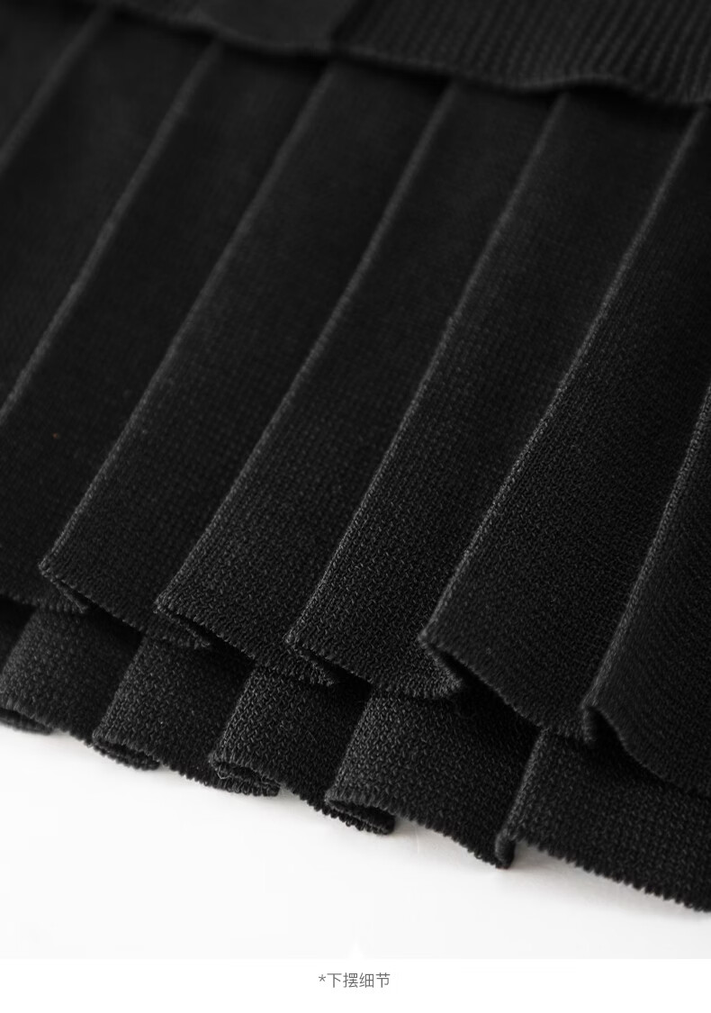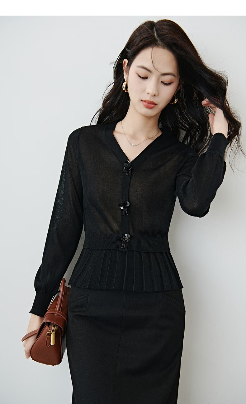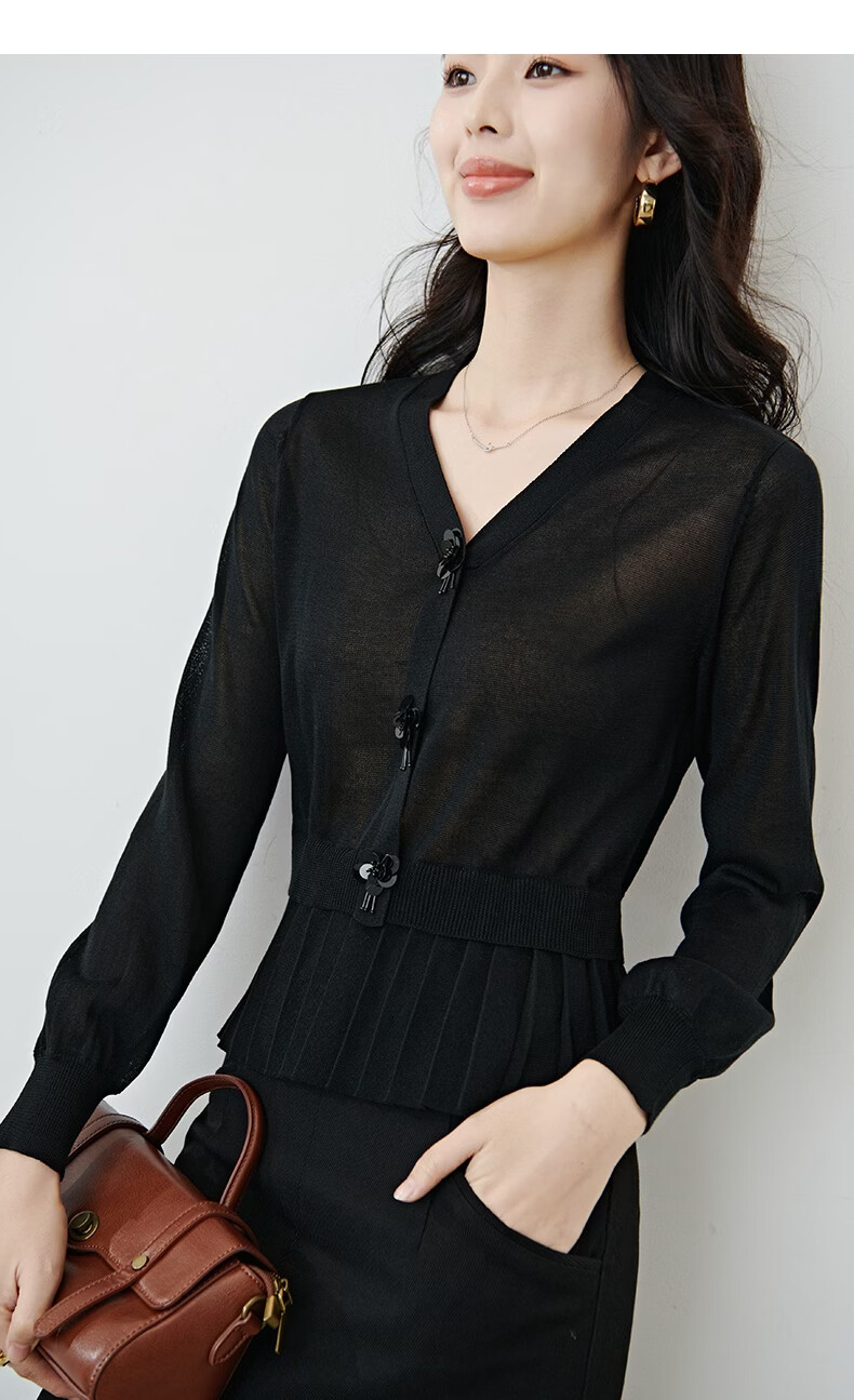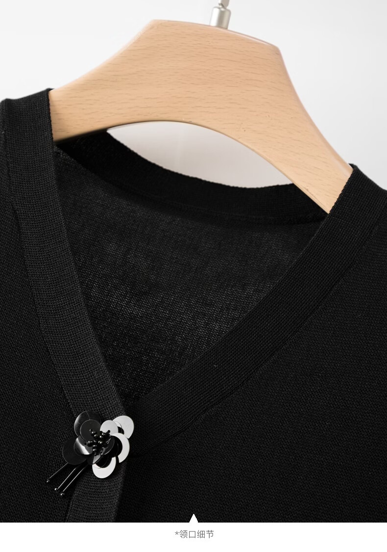 晚白2026春珠花扣装饰V领轻薄微透上衣小众百褶遮肉下摆莱赛尔针织衫 黑色 L