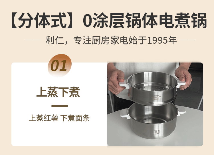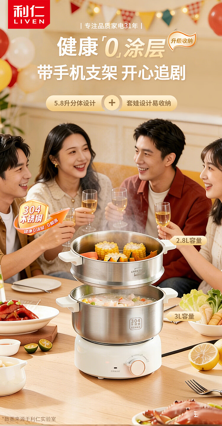 利仁(Liven)小钢人电火锅304不锈钢电煮锅分体式小电锅小型2-3人用3升小锅0涂层电蒸锅电热锅带蒸笼DHG-J368