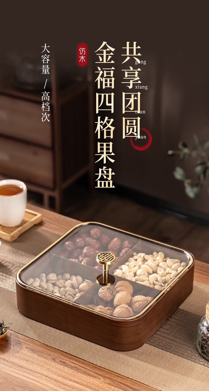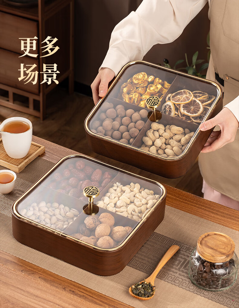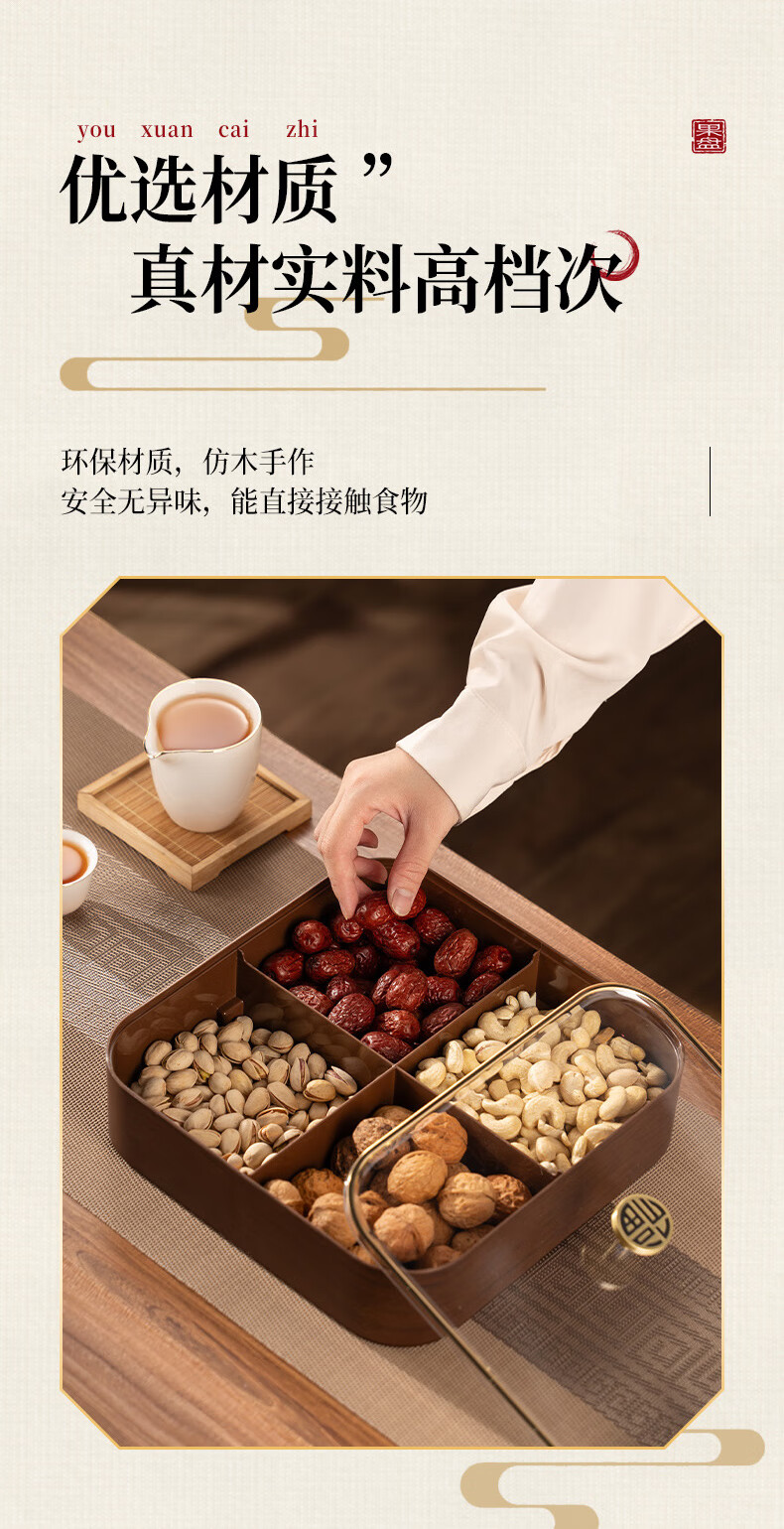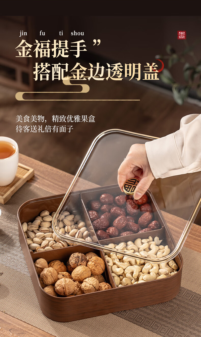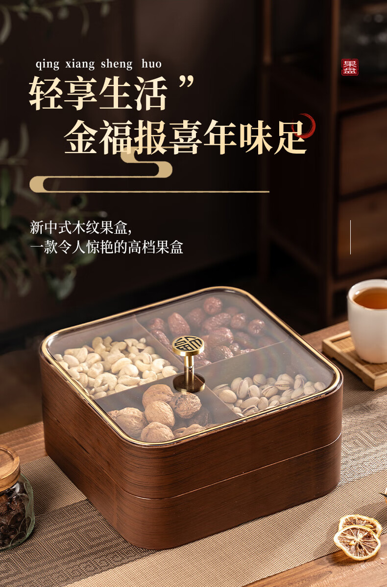 广意干果盘水果盘家用客厅仿木纹坚果盒糖果盒新款带盖中国风轻奢 仿木金福糖果盒加厚分格设计款