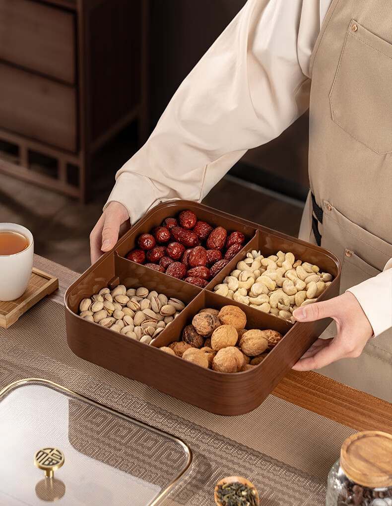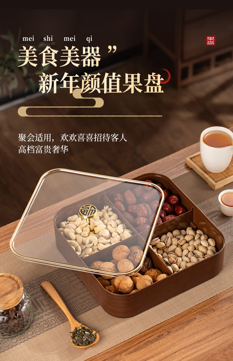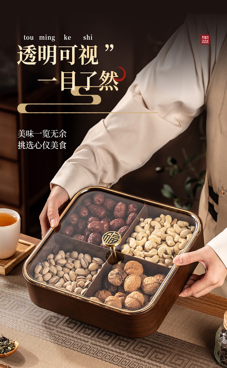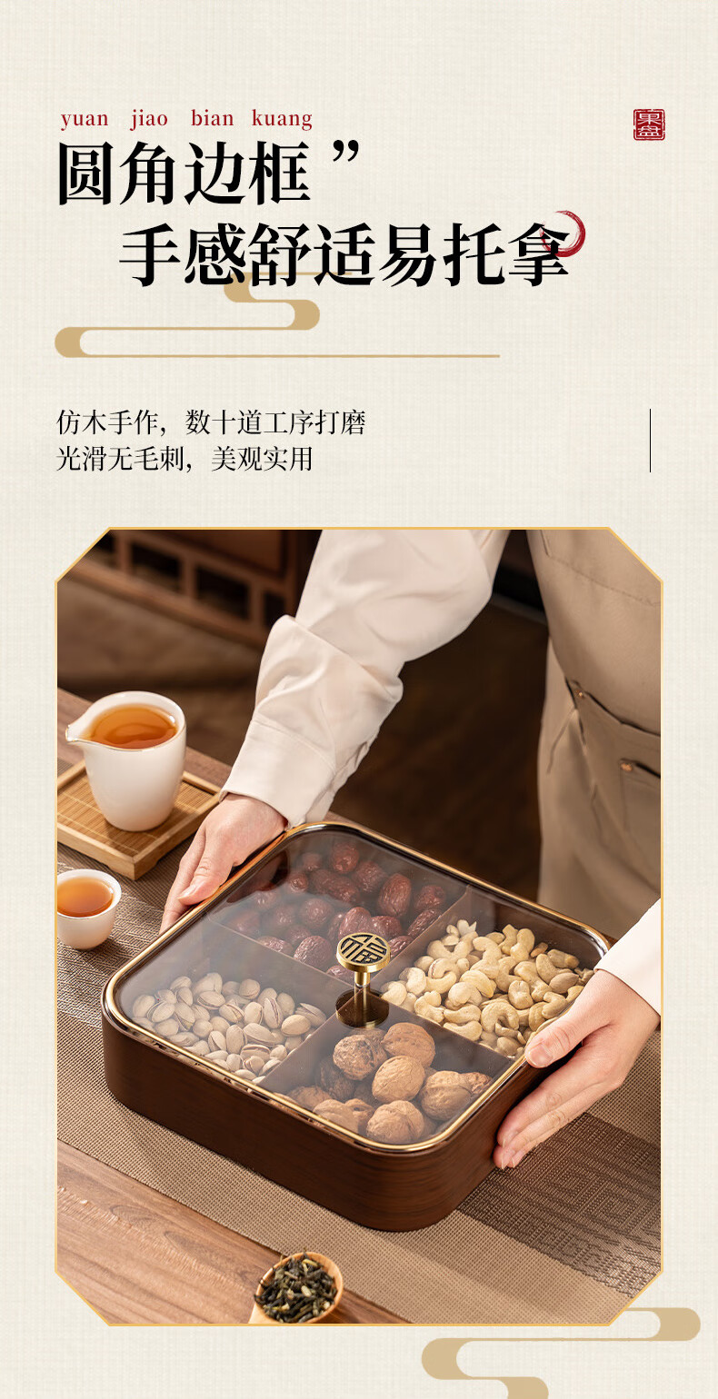 广意干果盘水果盘家用客厅仿木纹坚果盒糖果盒新款带盖中国风轻奢 仿木金福糖果盒加厚分格设计款