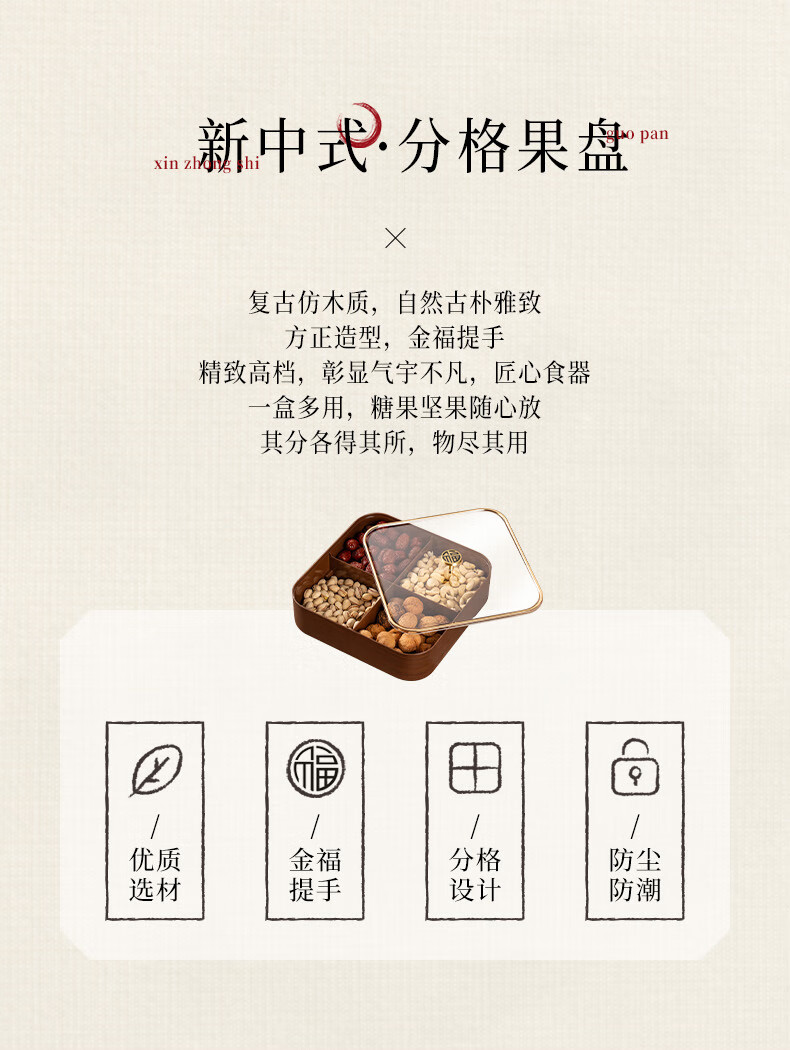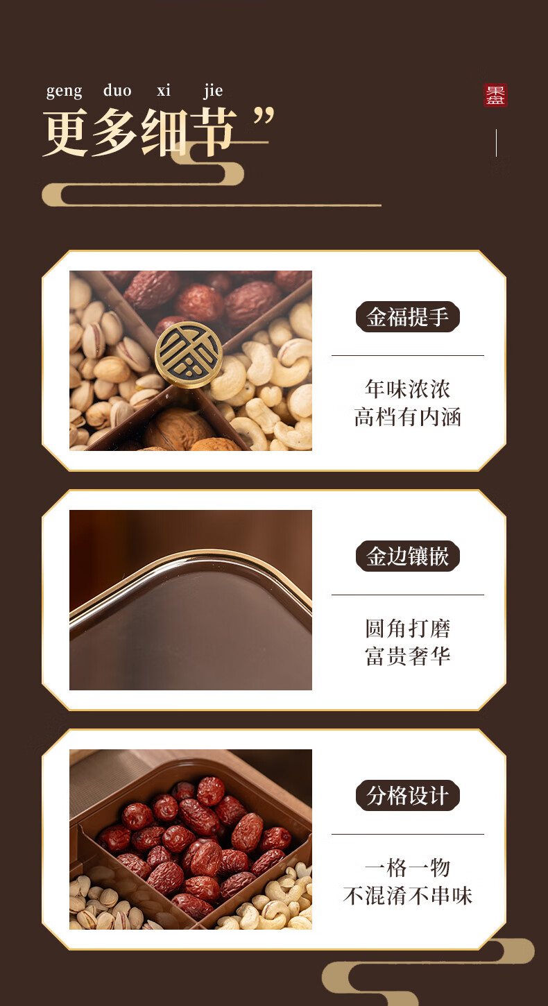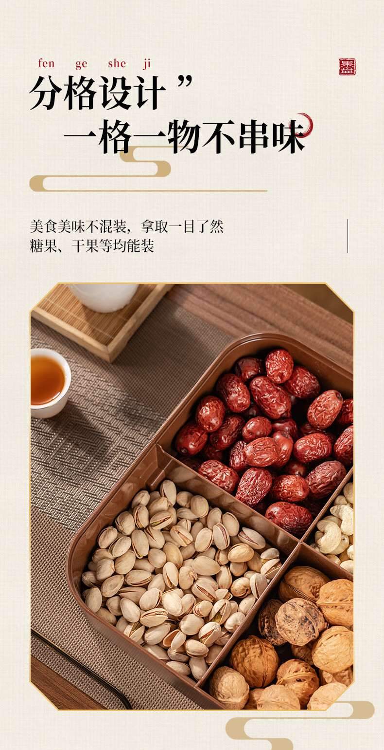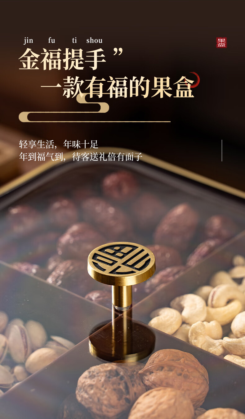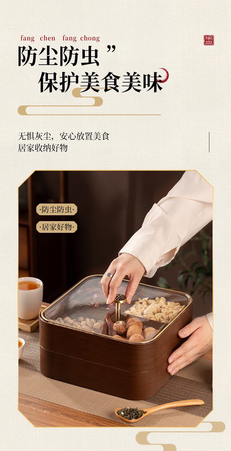 广意干果盘水果盘家用客厅仿木纹坚果盒糖果盒新款带盖中国风轻奢 仿木金福糖果盒加厚分格设计款