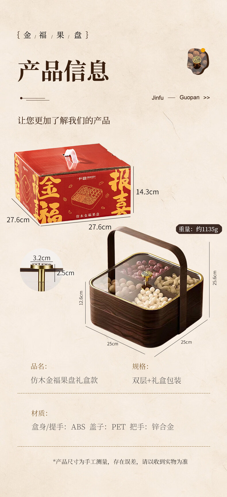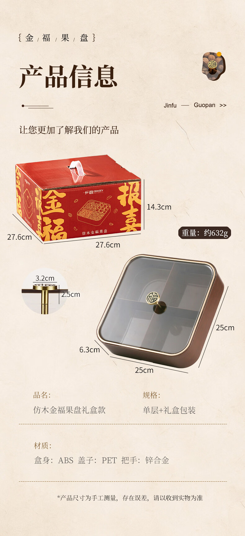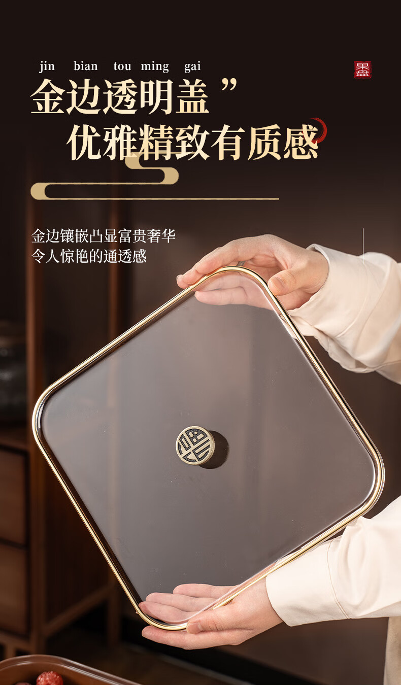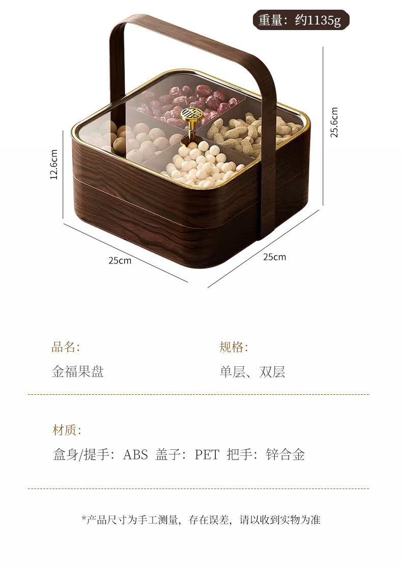 广意干果盘水果盘家用客厅仿木纹坚果盒糖果盒新款带盖中国风轻奢 仿木金福糖果盒加厚分格设计款