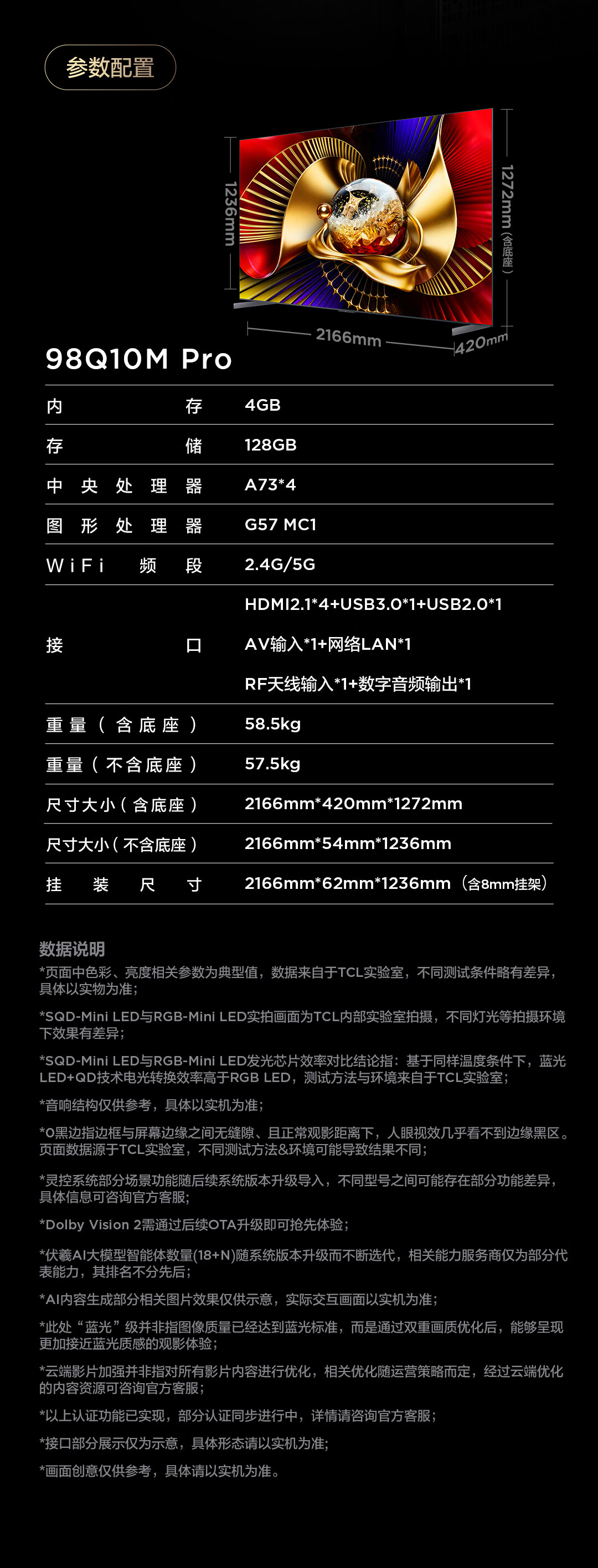 TCL电视 98Q10M Pro 98英寸 SQD-Mini LED 100%全局高色域 超级蝶翼华曜屏 万象分区 98/100英寸 护眼