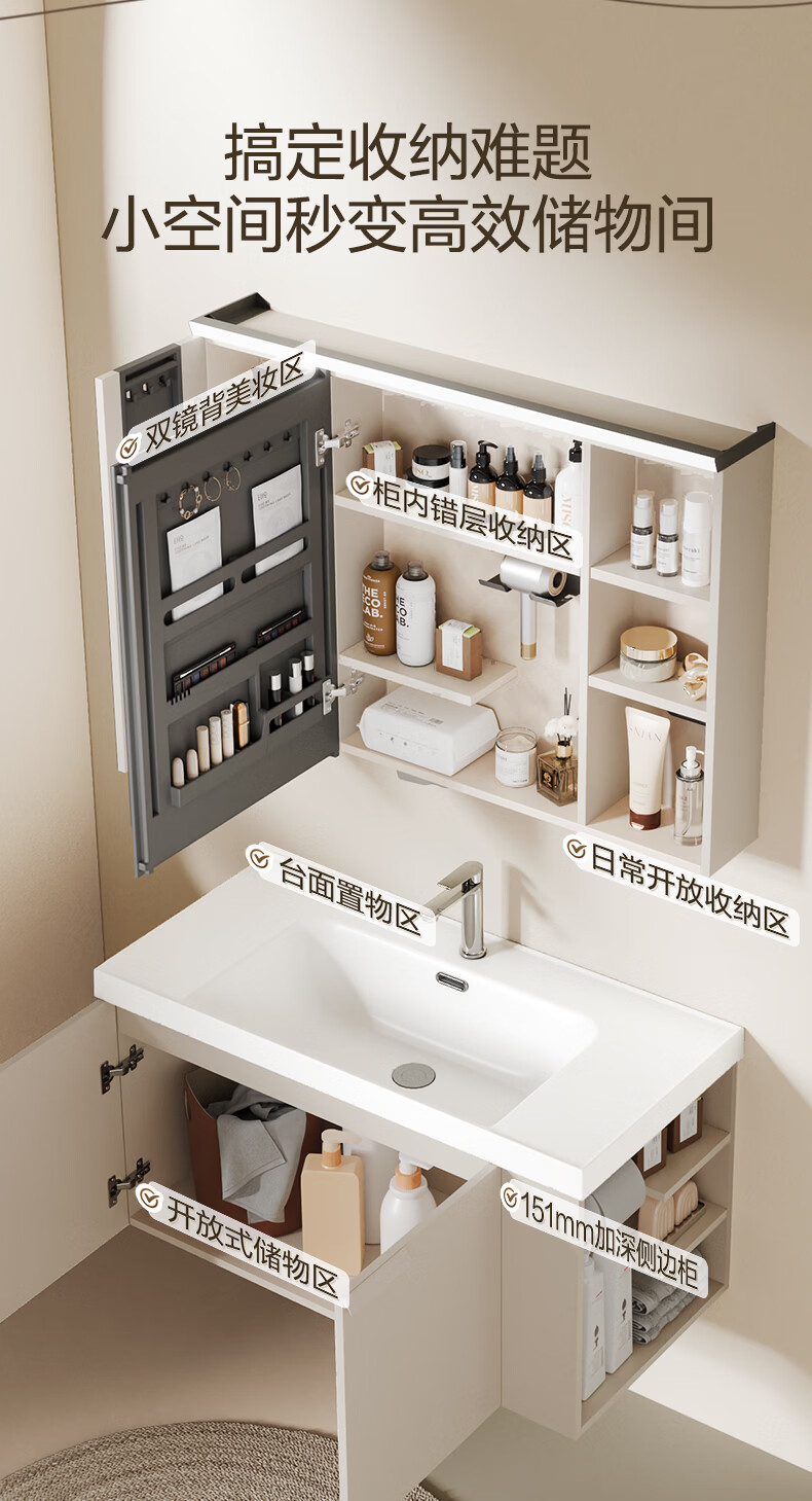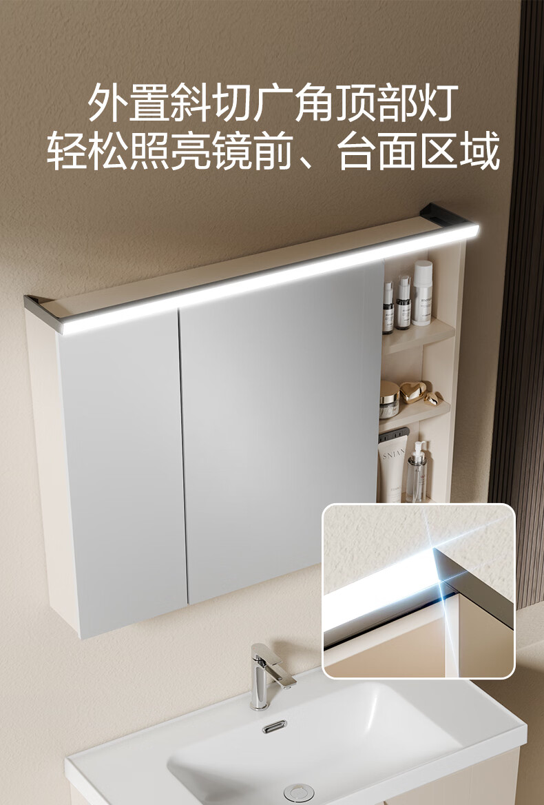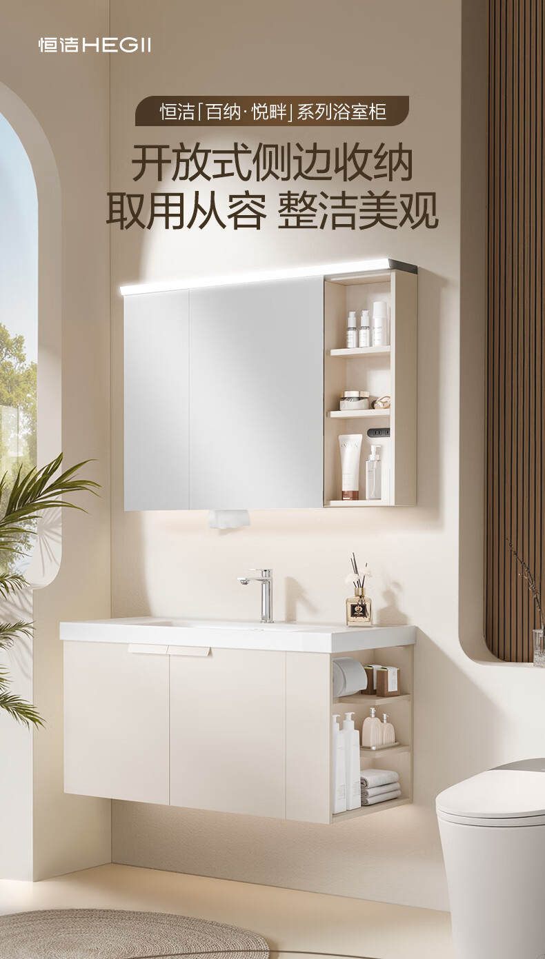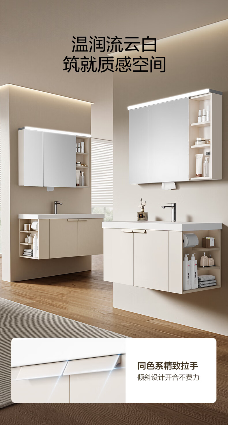 恒洁(HEGII)浴室柜 奶油风一体陶瓷台盆多功能收纳镜柜卫生间浴室柜BC2503S 【基础镜柜款】流云白80cm(不含龙头)