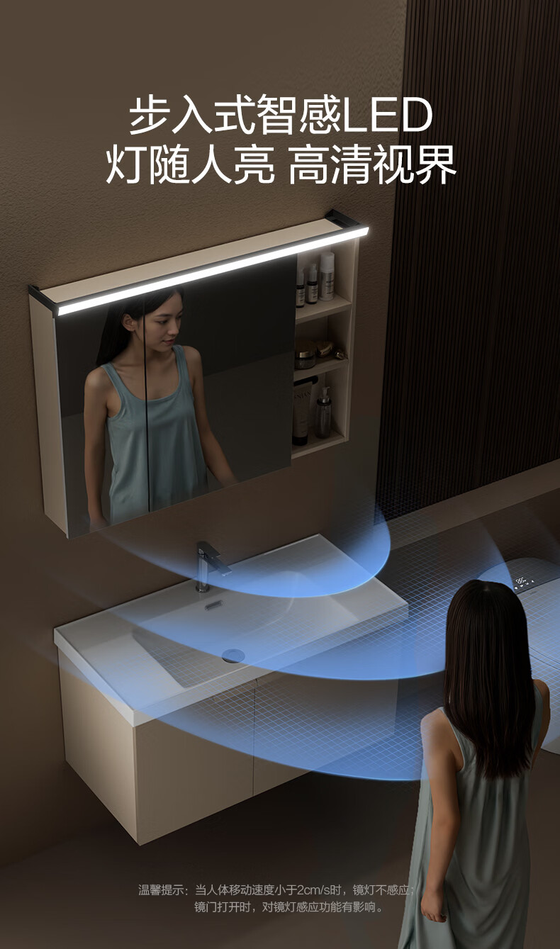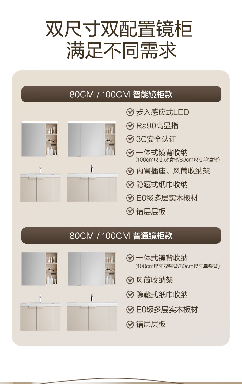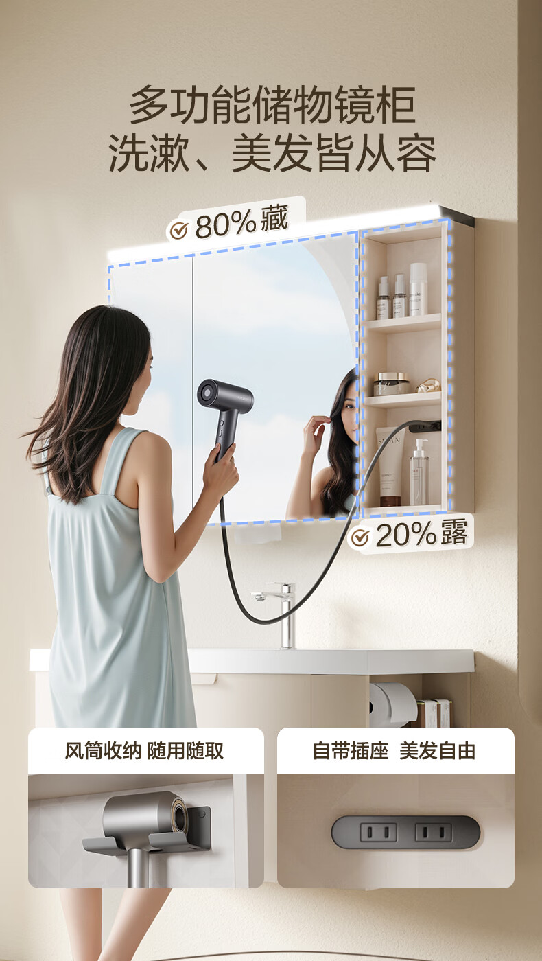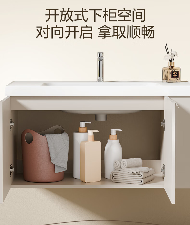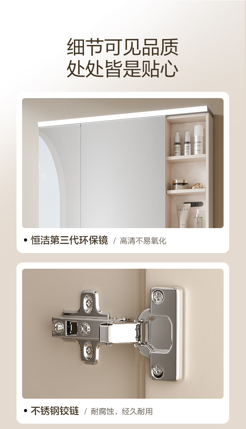恒洁(HEGII)浴室柜 奶油风一体陶瓷台盆多功能收纳镜柜卫生间浴室柜BC2503S 【基础镜柜款】流云白80cm(不含龙头)