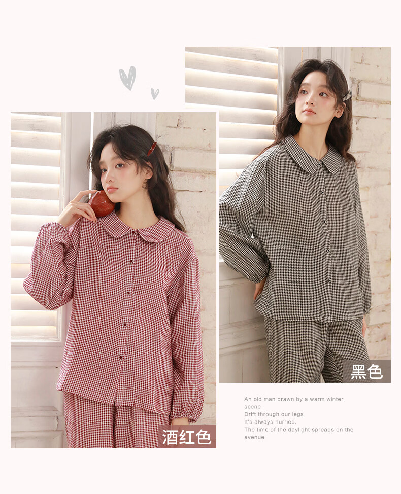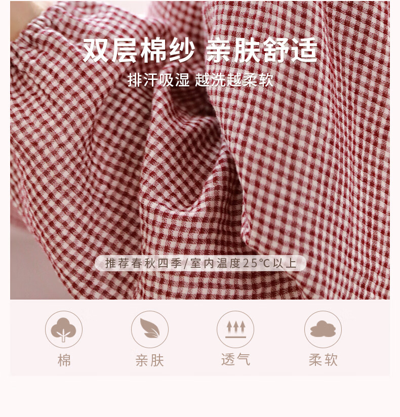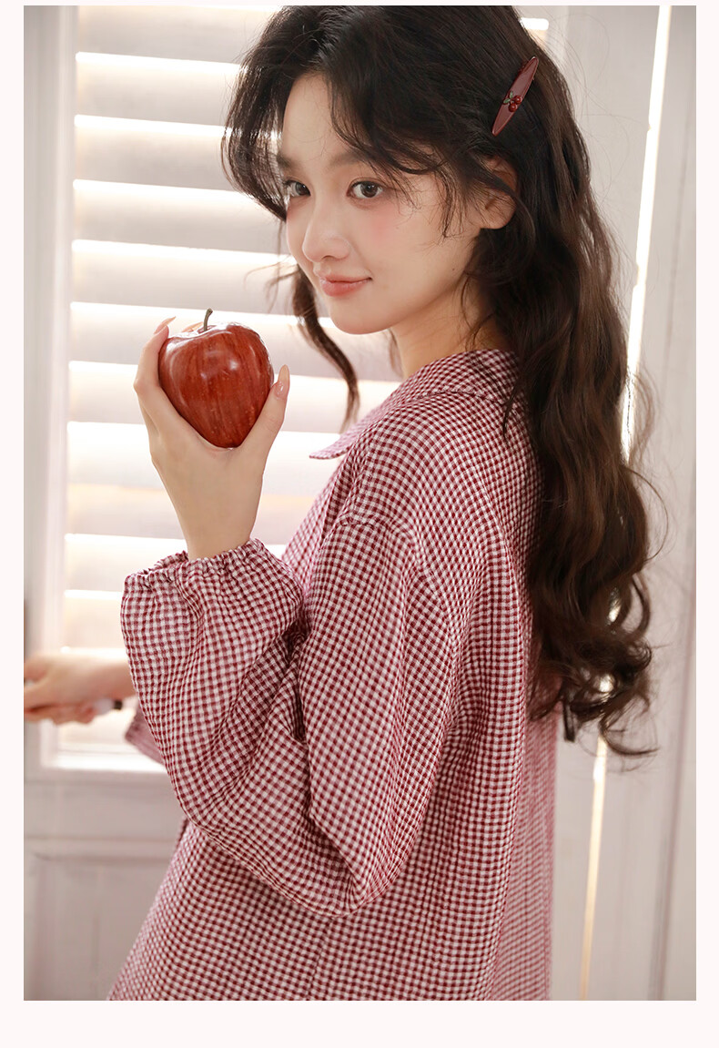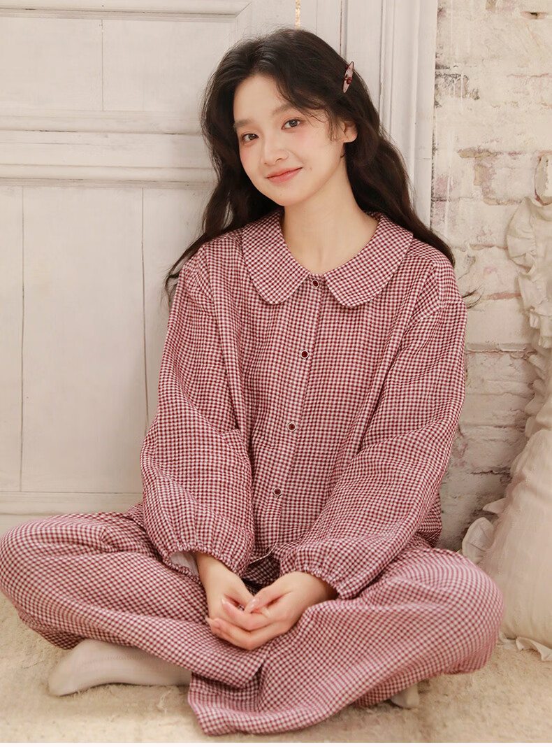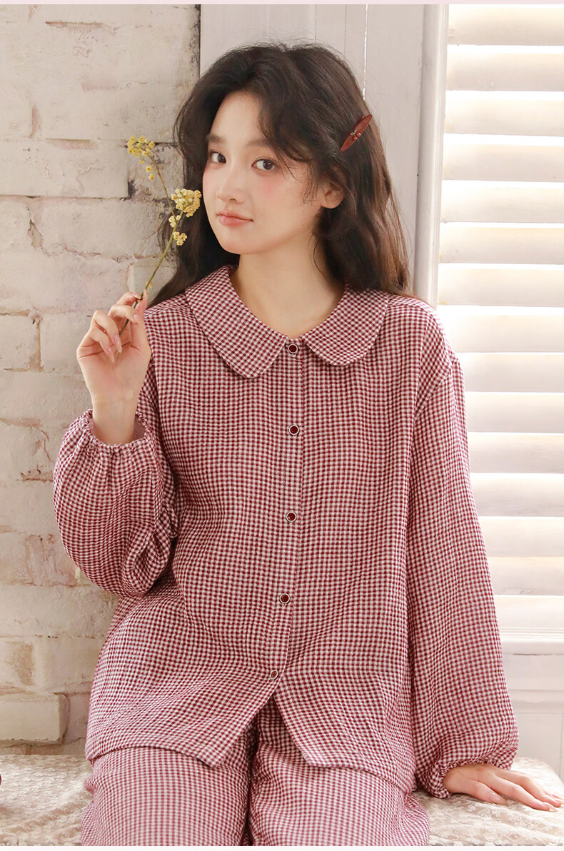 蔓秋 MEJU春季新款格颜三层纱女士长袖长裤家居服套装 红色 M 110斤以内