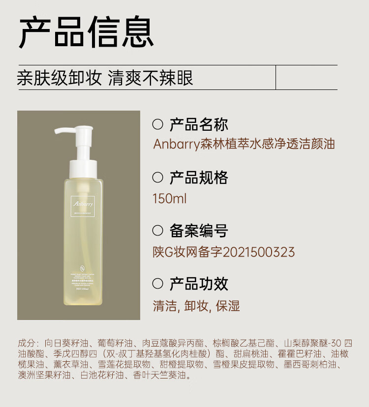 安蓓芮(ANBARRY)森林植萃水感净透洁颜油卸妆水清洁保湿敏感肌肤适用官方正品 1瓶体验
