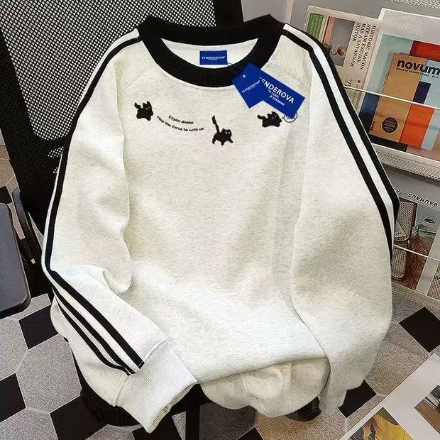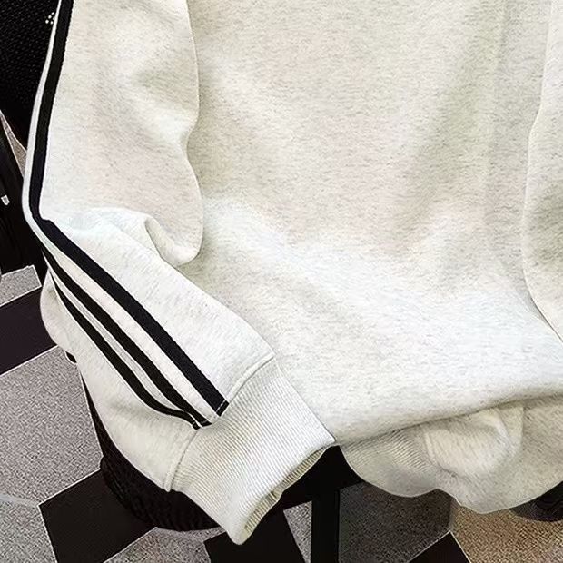 美式三条杠圆领卫衣女2024秋冬加绒百搭中长款涂鸦印花潮牌上衣服